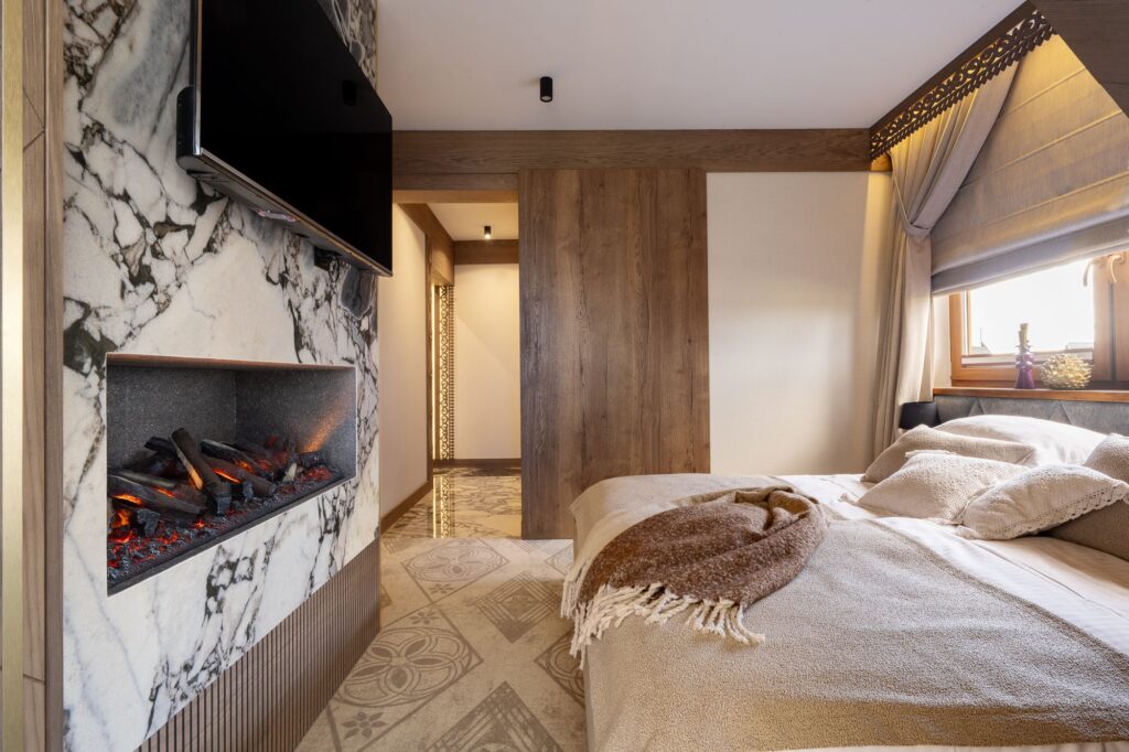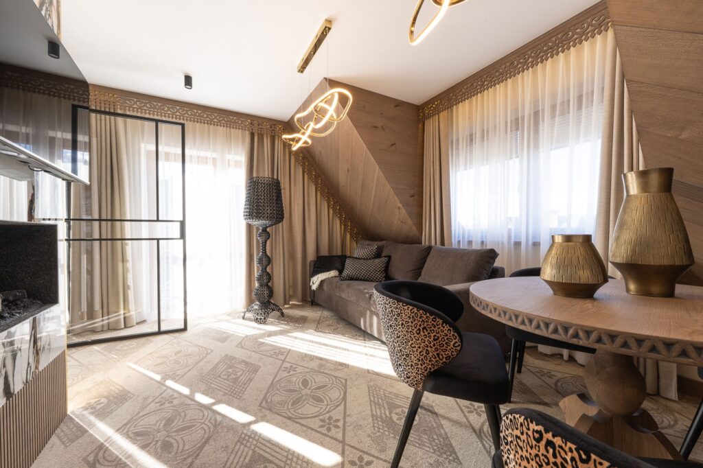 Nowoczesny apartament w stylu góralskim łączy tradycyjny urok Podhala z eleganckim designem. Wnętrze zdobią naturalne materiały – drewno, kamień i ciepłe tkaniny – zestawione z minimalistycznymi formami i nowoczesnym oświetleniem. Przestrzeń jest jasna, przytulna i funkcjonalna, z akcentami inspirowanymi kulturą góralską, takimi jak ręcznie rzeźbione detale, skóry owcze i motywy regionalne. Idealne miejsce dla osób ceniących komfort, styl i autentyczny klimat gór.